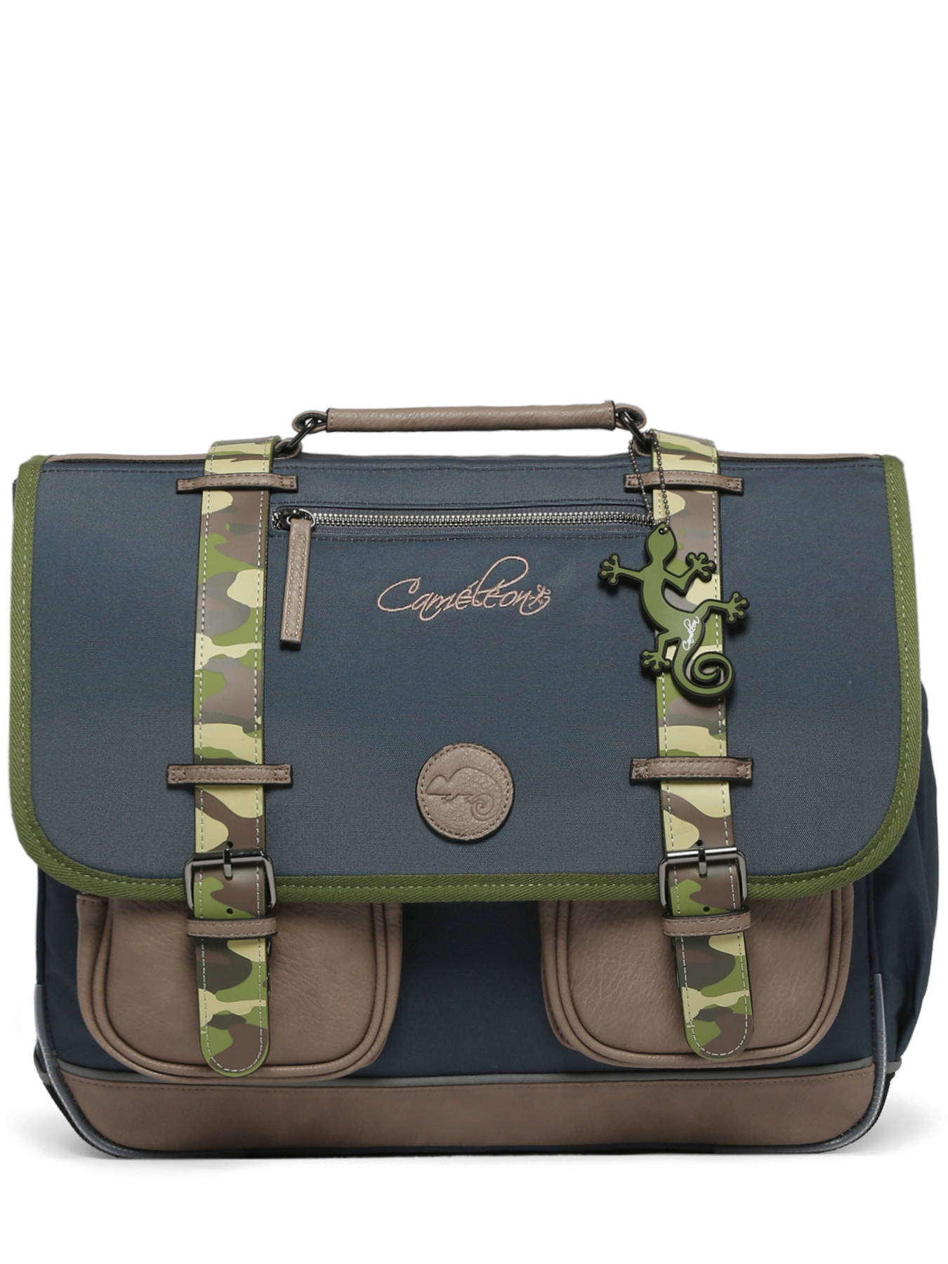 41 cm - 24 liter - 1.33 kg ~ Deze schooltas uit de Vintage collectie van het merk Caméléon heeft een breedte van 41 cm. Ideaal voor vanaf het 4de leerjaar! Dit model heeft een duidelijke vintage look, dankzij twee voorvakjes en de riempjes met gespen. De schooltas beschikt over drie ruime compartimenten, die schriften (24x32 cm), mappen en schoolboeken van A4 formaat kunnen bevatten. Onder de overslagflap bevindt zich ook een uniek opbergvakje, voorzien van een gratis liniaal. De twee kleine ritsvakjes vooraan zijn perfect om een snack of andere kleine spulletjes in te stoppen. Dit model beschikt ook over een naamlabel aan de achterzijde, en kan makkelijk gesloten worden dankzij een dubbel kliksysteem. Voor optimaal comfort zijn de rugzijde en schouderbanden extra gewatteerd. Dankzij enkele reflectoren kan uw kind zich ook veilig in het verkeer begeven. Vintage op z'n mooist!