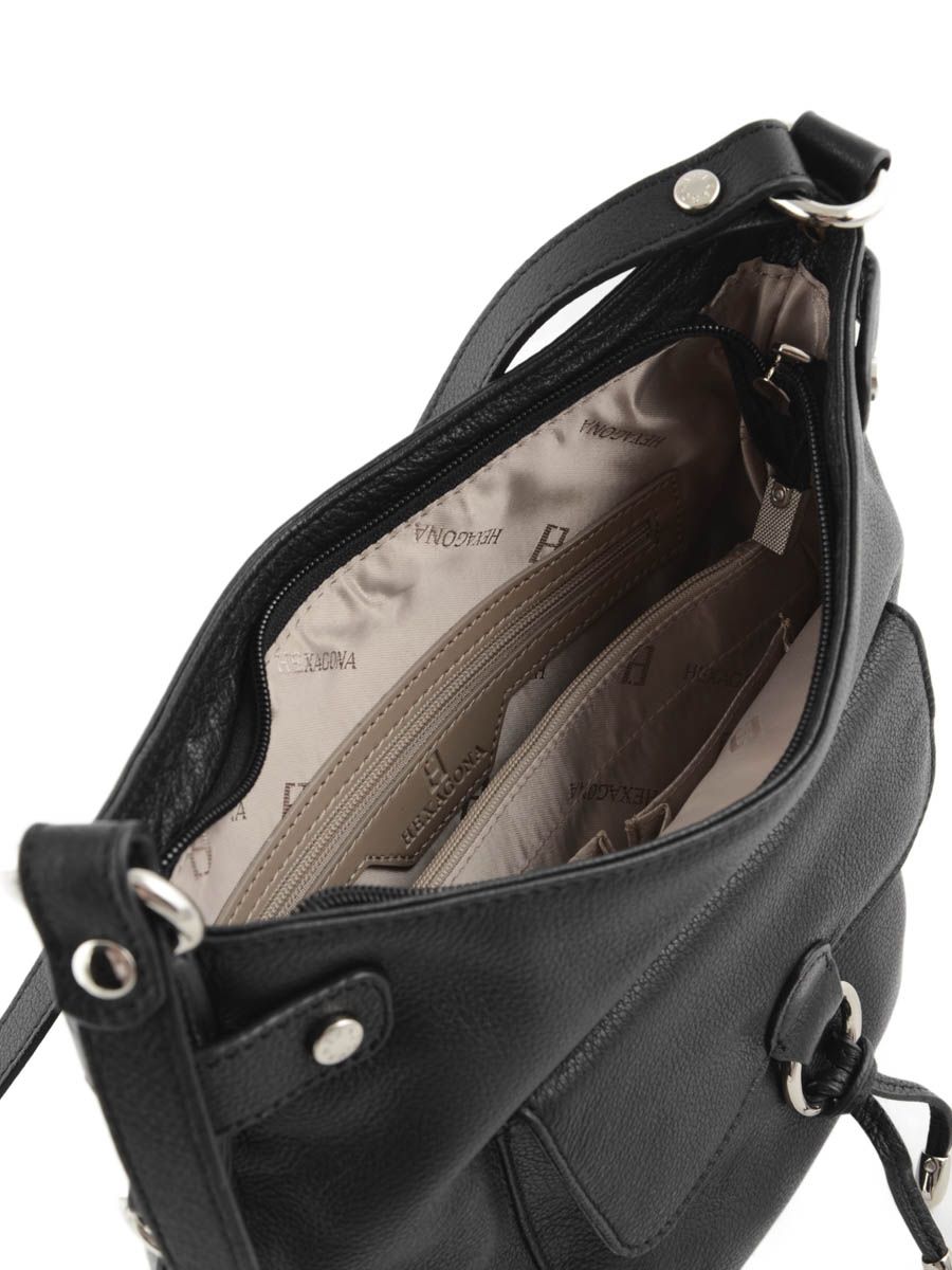 Een multifunctionele cross body tas uit de 'Pretty' collectie van het merk Hexagona. Deze lederen tas beschikt over ruime compartimenten, gescheiden door een middenvakje met rits. Het aantrekkelijke voorzakje is voorzien van een elegant juweel, wat voor een speelse toets zorgt. Dankzij de lange lederen schouderriem kunt u dit model zowel gekruist als lang over de schouder dragen. Een echte aanrader voor dagelijks gebruik!